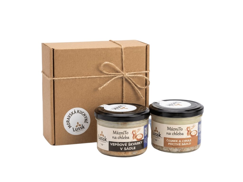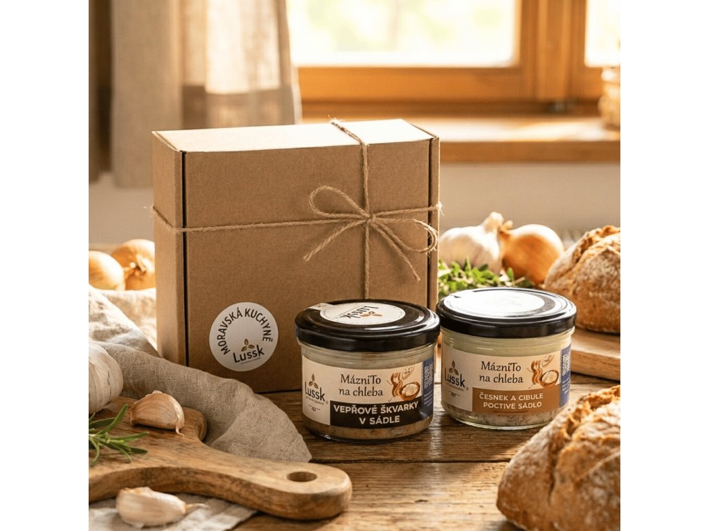 Poctivá dárková sada, která voní tradicí. Spojuje moravskou dvojku – Vepřové škvarky v sádle a MázniTo česnek a cibule. Chuť, která okamžitě připomene poctivou moravskou hostinu. Hotový dárek, připravený rovnou k darování. Stačí otevřít, namazat na čerstvý chleba a užít si pravou moravskou tradici – ideální na svačinu, posezení s přáteli nebo rychlou hostinu.