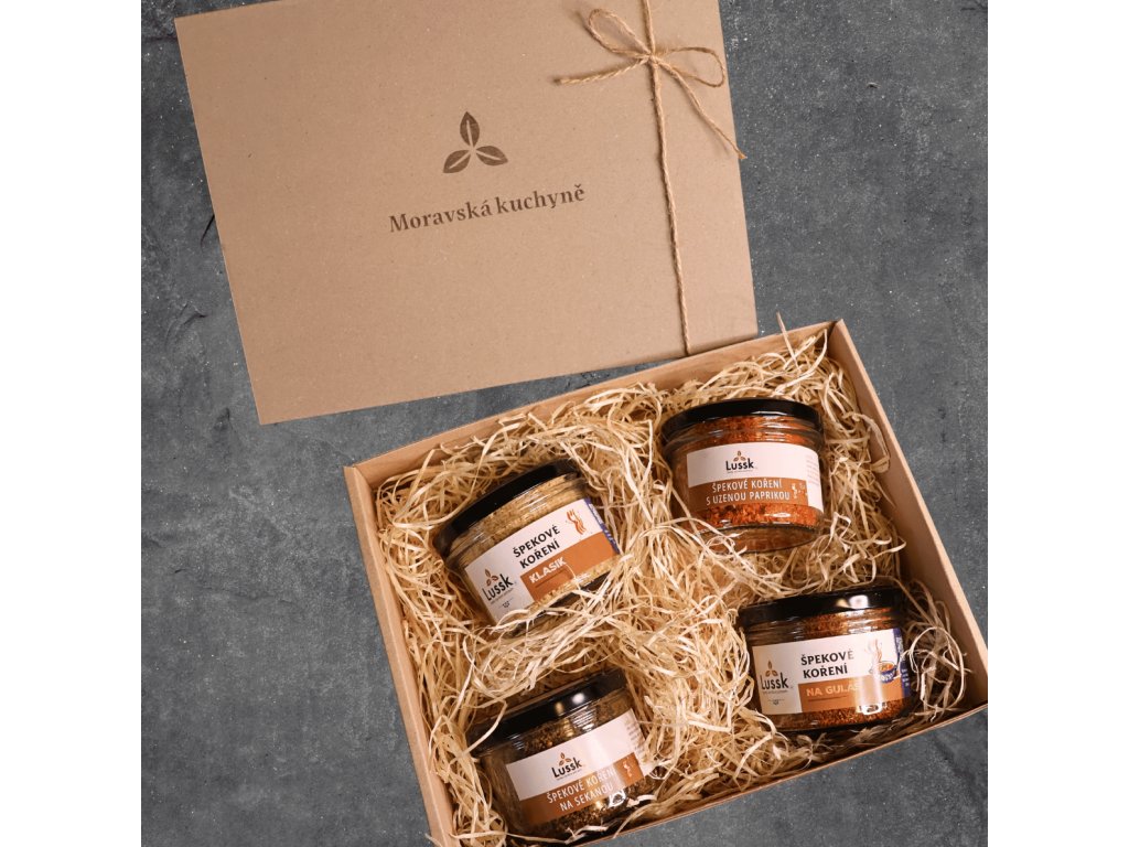 Dárková sada Moravská kuchyně obsahuje čtyři jedinečné druhy špekového koření, se kterými snadno vykouzlíte tradiční i moderní moravské pokrmy. Každé koření je baleno v elegantní kořence po 130 g, takže nejen krásně vypadá, ale i dlouho vydrží.