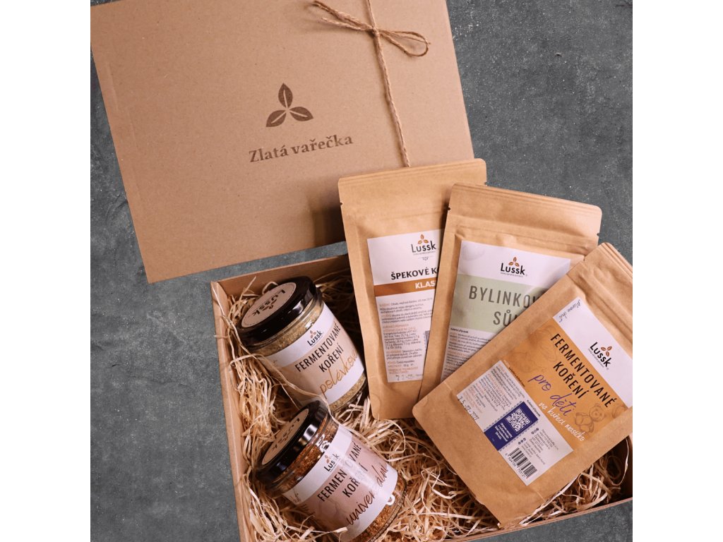 Dárková sada Zlatá vařečka je pokladnicí chutí — obsahuje mix našich nejprodávanějších směsí a solí, které promění každé vaření v kulinářský zážitek. Je ideální pro každého, kdo rád objevuje nové chuťové kombinace, nebo chce mít doma vždy po ruce osvědčené koření.