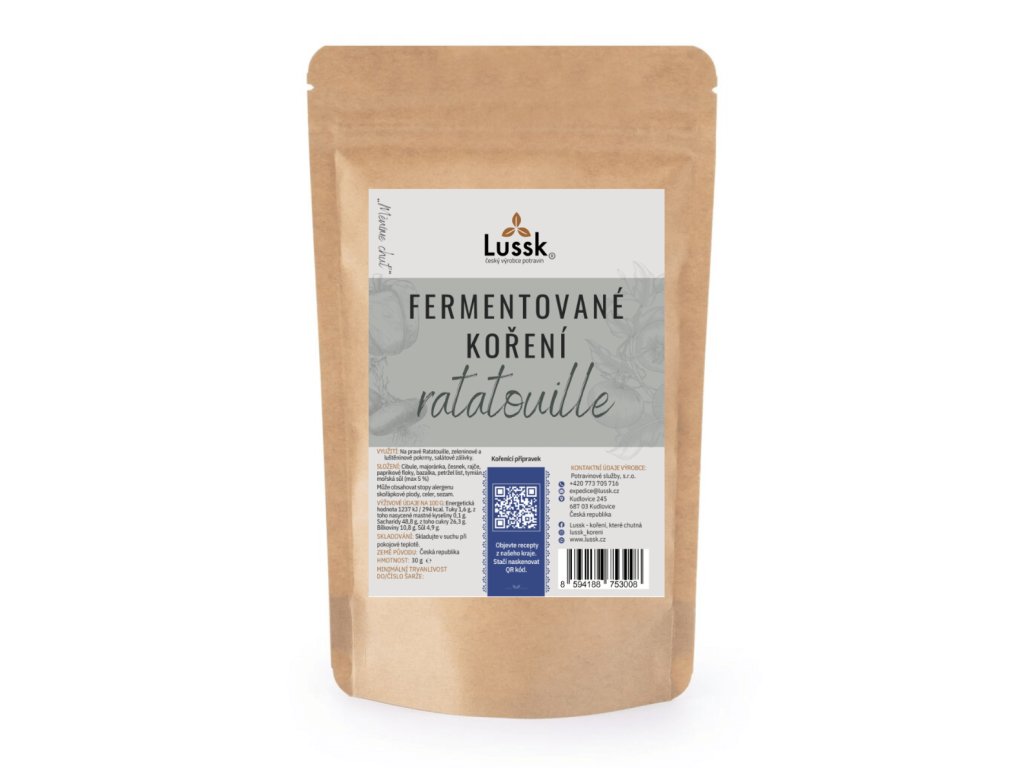 Fermentované koření Ratatouille je směs zeleniny, bylinek a koření vytvořená přirozenou fermentací. Je určené především k dochucení zeleninových pokrmů a tradičního ratatouille. Díky fermentaci se chuť zeleniny a bylinek lépe uvolňuje a snadno se propojí s ostatními surovinami při vaření. Směs obsahuje minimum mořské soli a staví hlavně na chuti samotné zeleniny. Hodí se pro pečená, dušená i restovaná zeleninová jídla.
