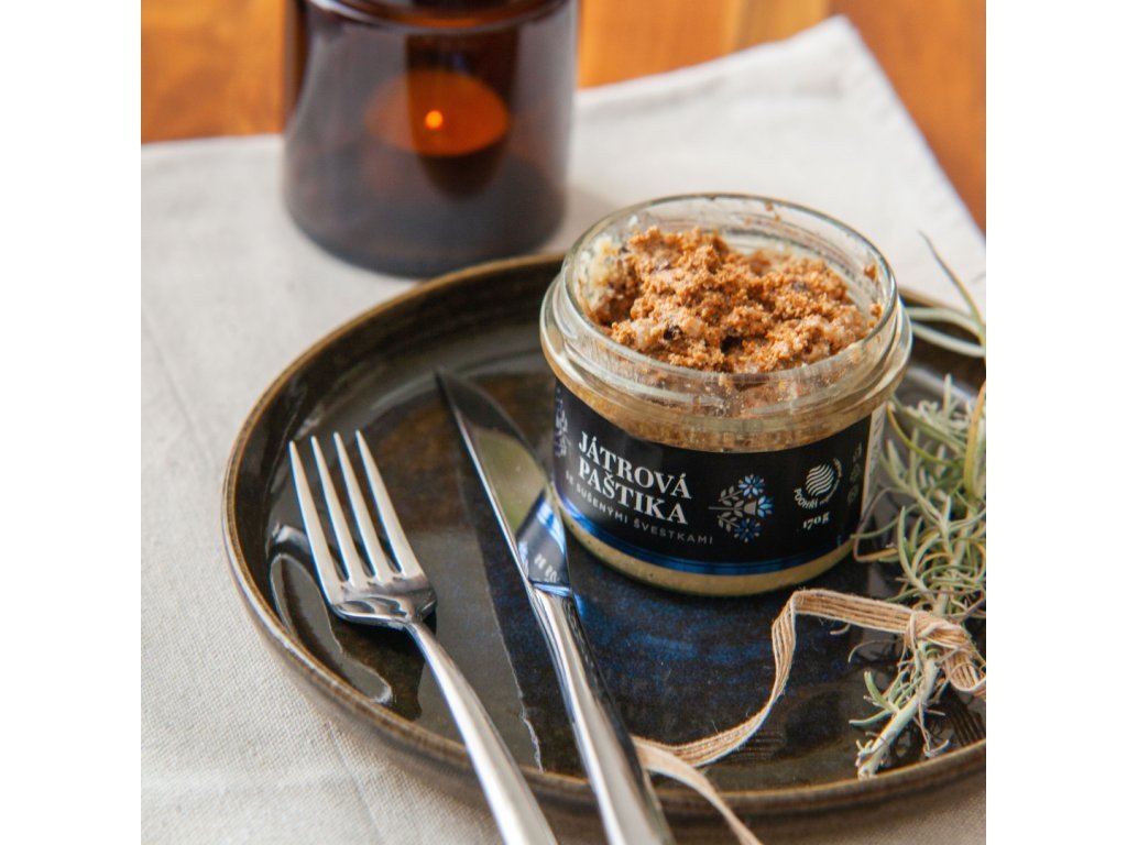 Tip na servírování: Podávejte při pokojové teplotě a před konzumací promíchejte, aby se chutě dokonale propojily. Skvěle chutná s čerstvým chlebem, křupavou bagetou a nakládaným sladkokyselým ovocem, které podtrhne bohatou chuť jater a švestek. Pro dokonalý zážitek doplňte paštiku o karamelizovanou cibuli nebo hrst pečených ořechů.