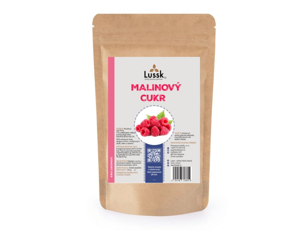 Malinový cukr – 95% cukr, 5% lyofilizované maliny je lahodná směs, která spojuje čistou sladkost cukru s intenzivní chutí a vůní zralých malin. Tento jedinečný cukr obsahuje 5% lyofilizovaných malin, které byly šetrně sušeny mrazem, aby si uchovaly své přírodní aroma, barvu a všechny důležité živiny.