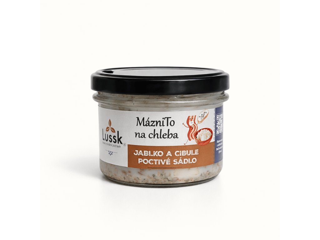 | Obsahuje: | Vepřové sádlo škvařené, jablko 25 %, cibule smažená (cibule, rostlinný olej, pšeničná mouka) 12 %, oregáno, sůl |