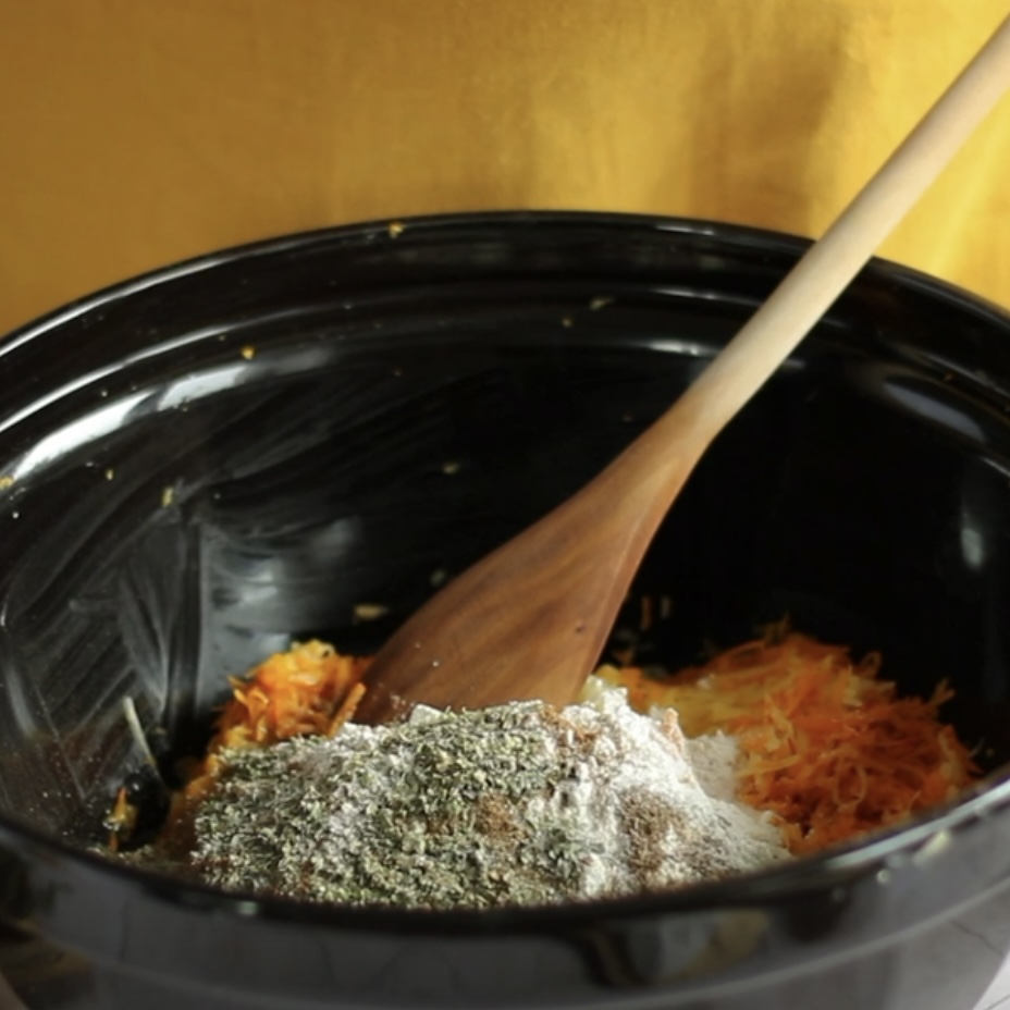 Brambory a dýni nastrouhejte najemno, lehce z nich vymačkejte přebytečnou tekutinu- pokud nějaká bude a vmíchejte vejce, česnek, mouku, majoránku, kmín, dýňové koření sůl a pepř. Důkladně promíchejte.