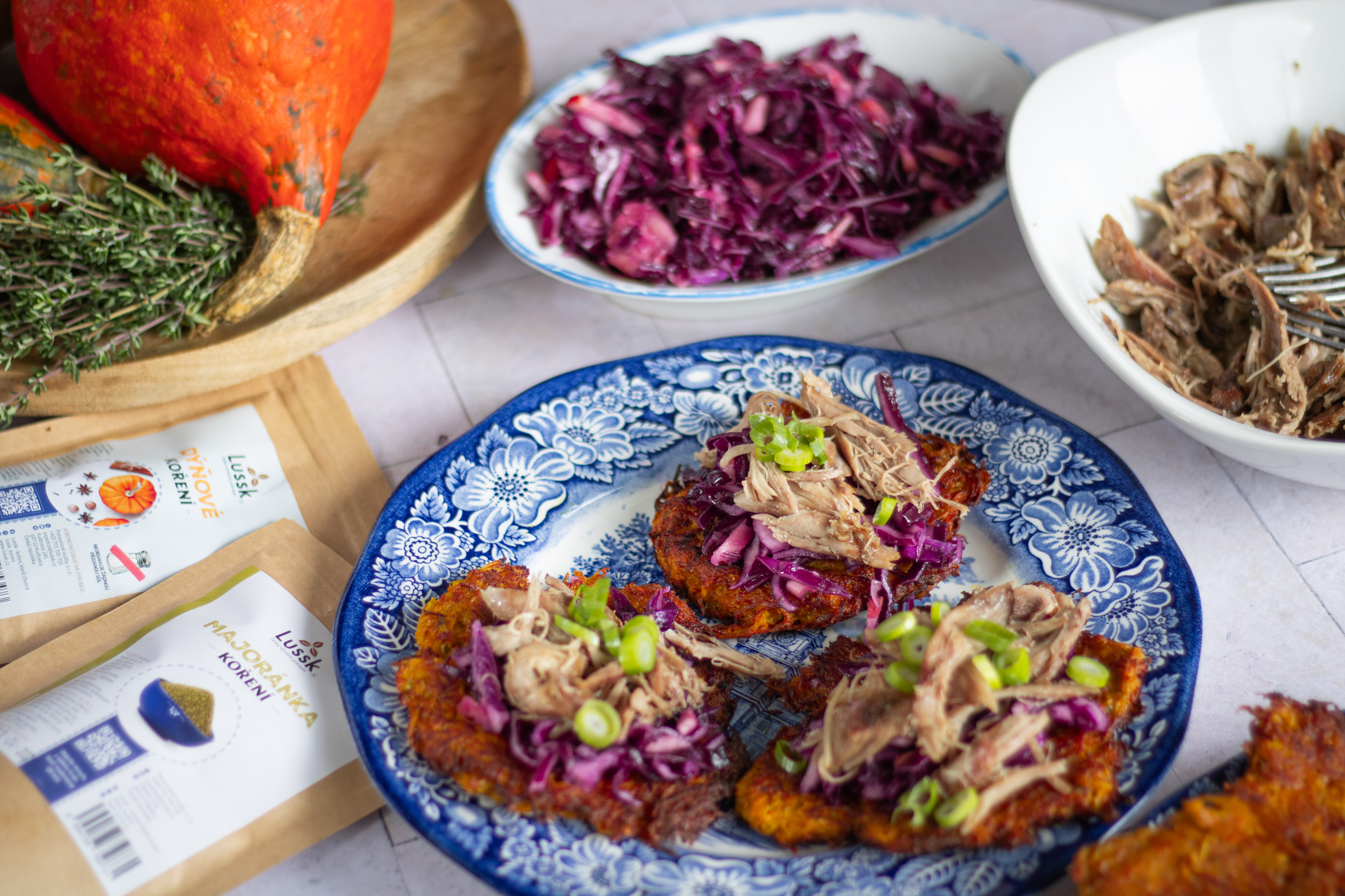 Dýňové bramboráky s trhaným kachním a zelným salátkem z červeného zelí
