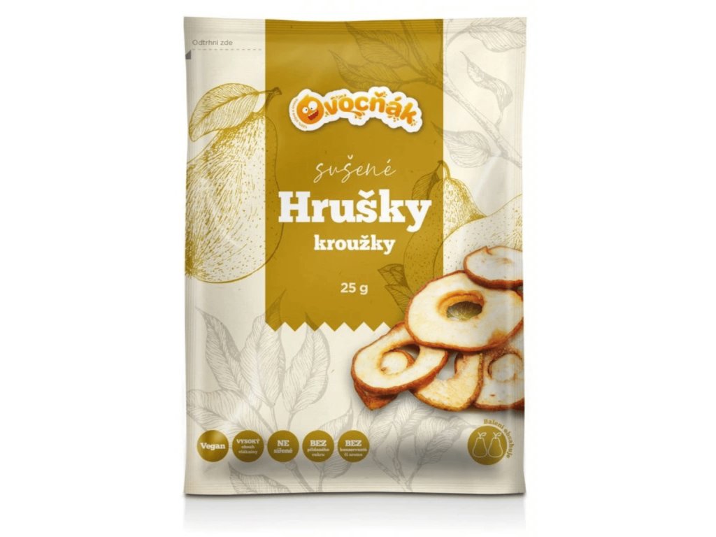 Ručně vybíráme jen ty nejhezčí hrušky, a na jedno balení spotřebujeme až dvě středně velké! Po tom, co je usušíme, se zmenší na výsledný sáček s kroužky a konečně vypadají jako malá svačinka. Buďte si však jistí, že je pořádná a dodá vašemu tělu potřebnou energii.